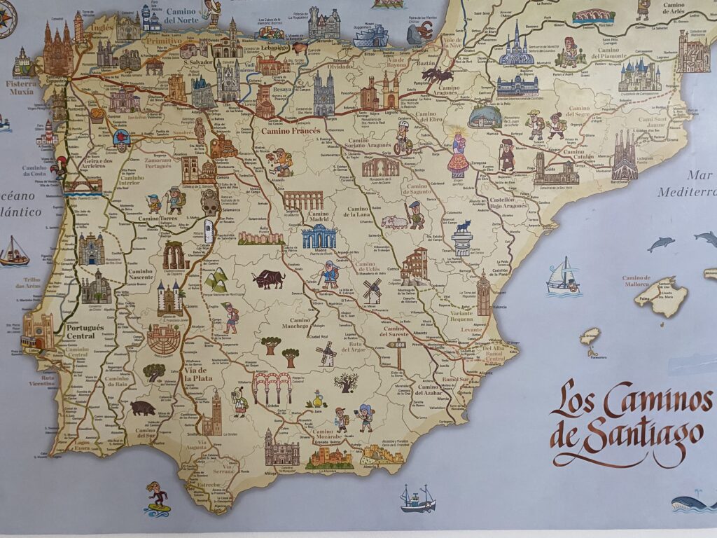 Abans de sortir, faig una foto a un mapa dels molts que hi han del Camino, però aquest m’agrada…hi han petits dibuixets representatius de cada lloc…m penso que me’l compraré!!