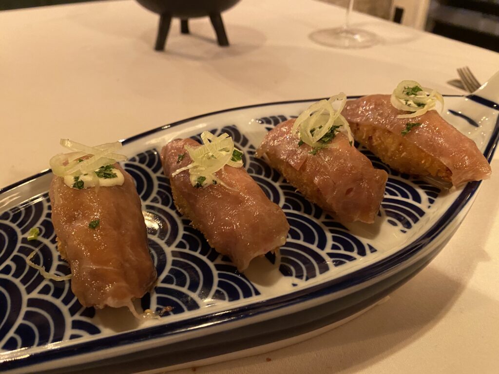Croquetes-Sashimi de pernil de gla i o-toro de tonyina: brutaaals