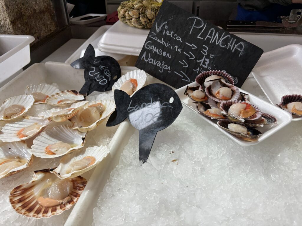 Vaig a la Vinateria del Mercat, i agafo unes vieires a la pescateria on te les fan al moment, i tu ja vas en el plateret a fer un vi. Esta be