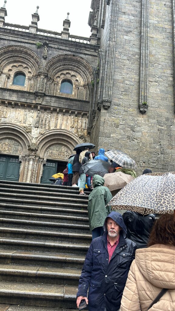 Surto…són les 12.00, i mireu la cua que hi ha per entrar a la Misa del Peregrino, tot i que plou, i que ja acaba de començar i tota esta gent no entrarà…