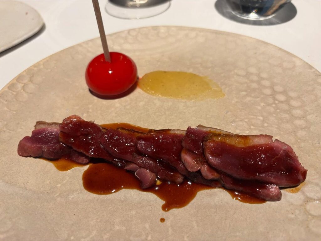 Magret de pato del delta madurat a la brasa amb poma de fira