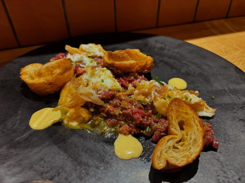 3️⃣Steak tartar de bou, ou campero fregit i croissant cruixent