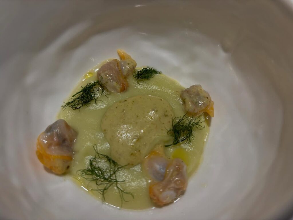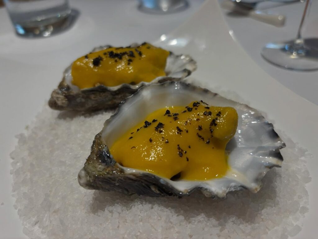 Ostra (fregida) en una crema d’all porto
