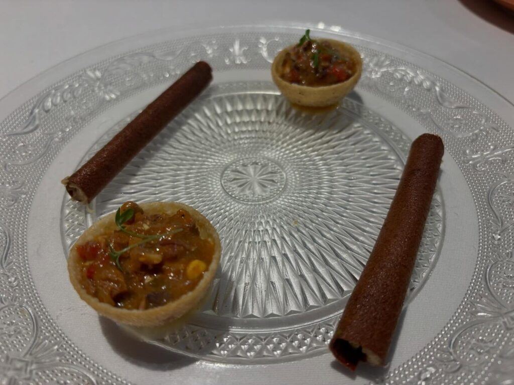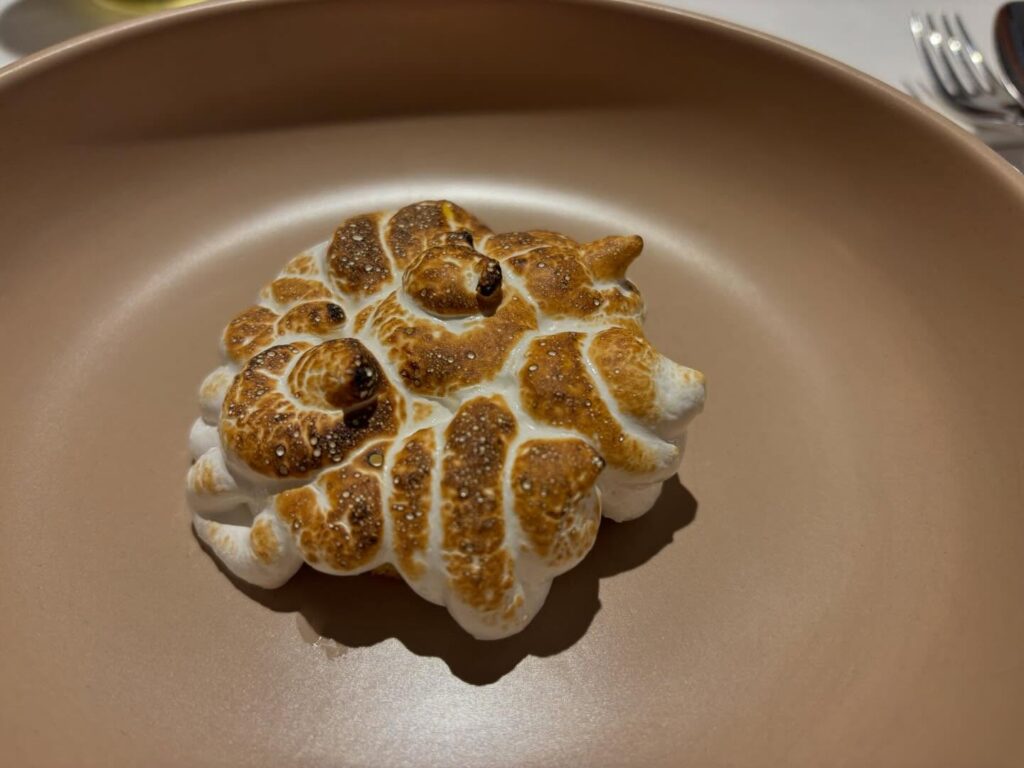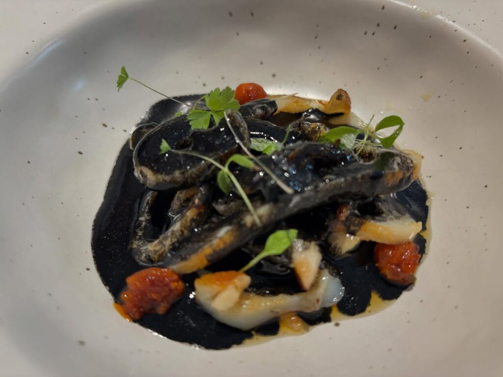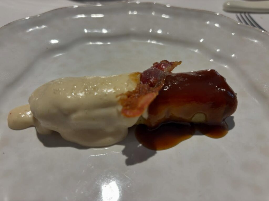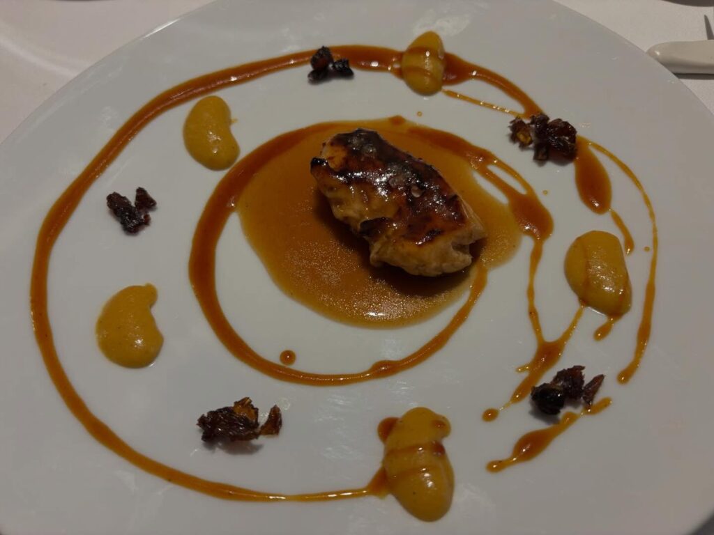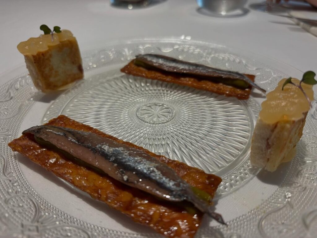 Anxova de Vinaròs en cuixent caramelitzat i bikibi d’anguila fumada, foie i compota de moniato blanc