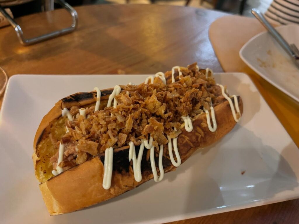 6️⃣Brioche farcit de costella de tocino a la barbacoa amb mostassa, ceba cruixent i maionesa de Wasabi