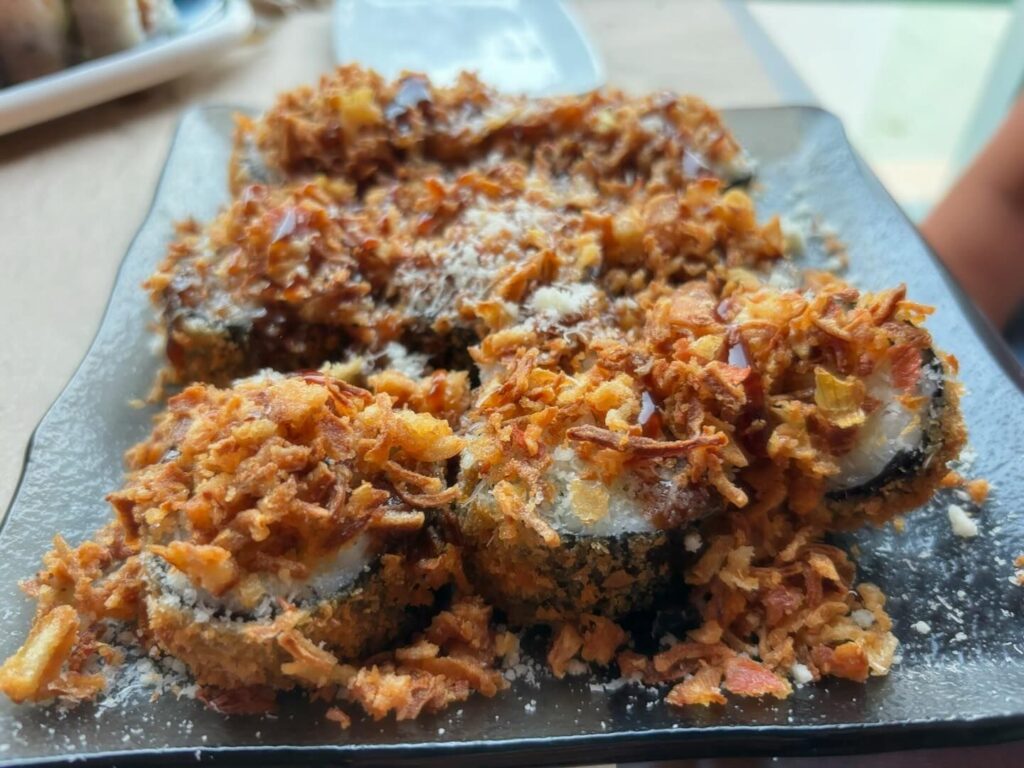 3️⃣Urakami Tentation Roll: Salmó cruixent, aguacate, formatge crema, topping de platan, salsa spicy
